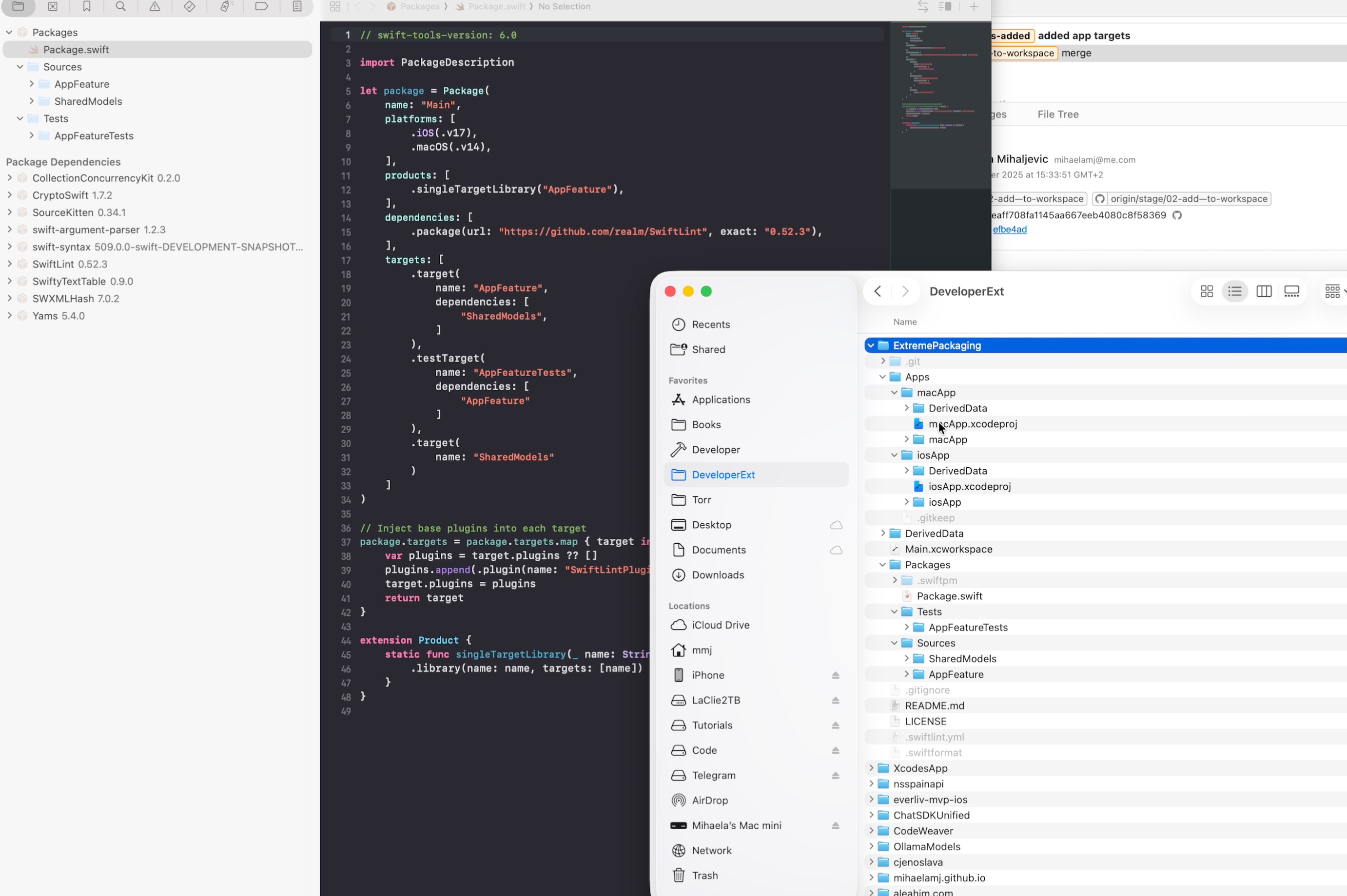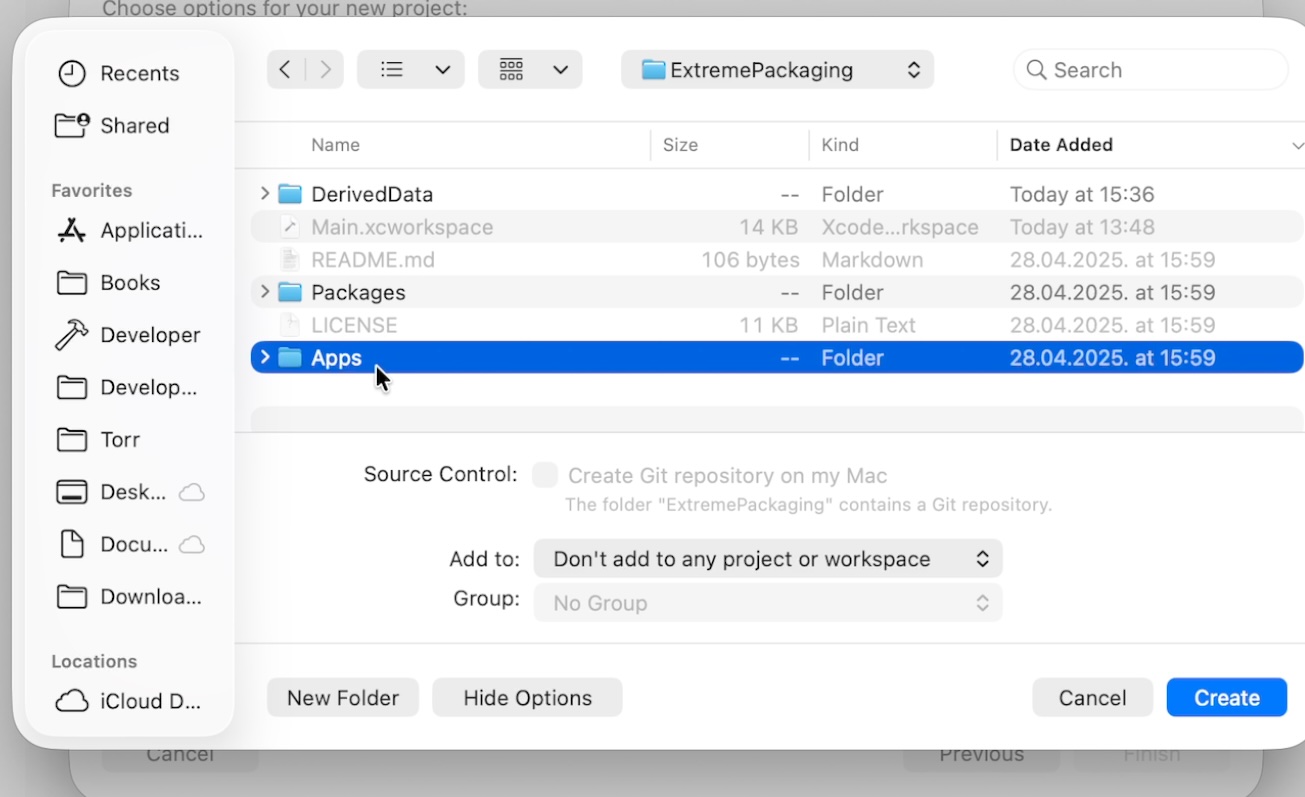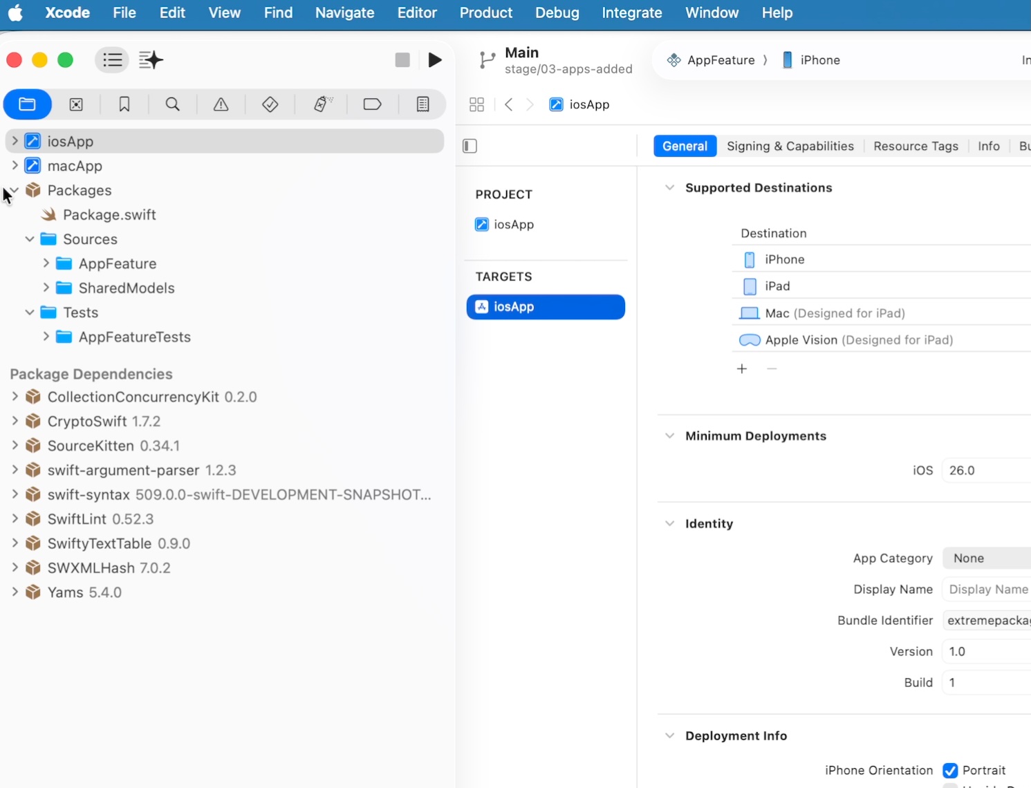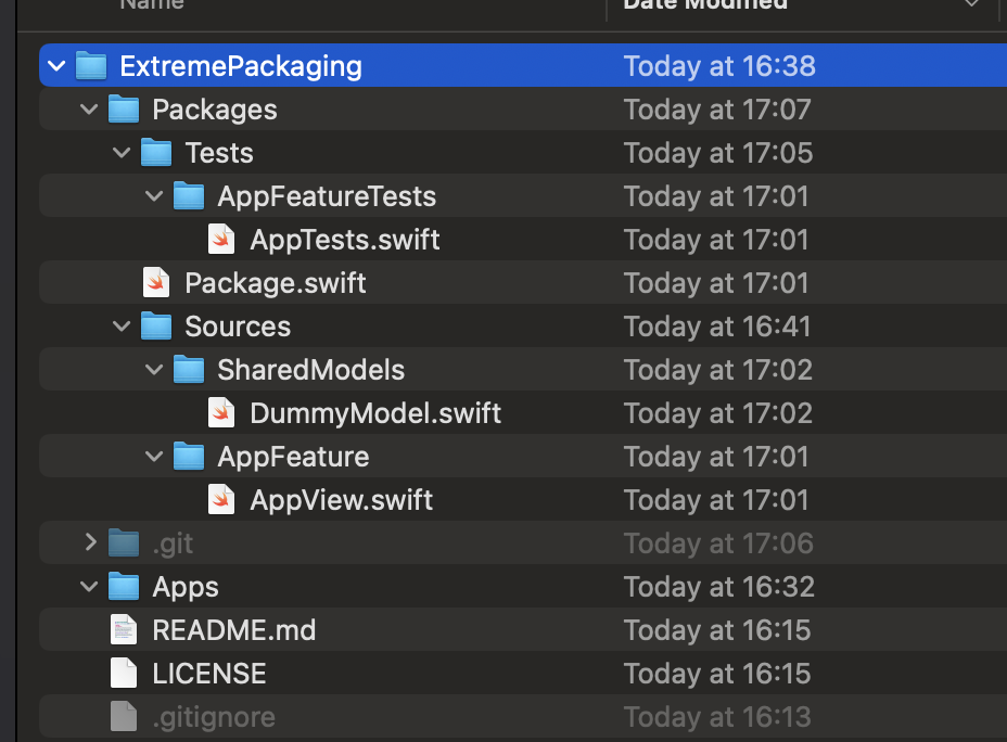 The first step in Extreme Packaging is establishing a clear and reproducible project structure that can evolve gradually through defined stages. Each stage in the repository builds upon the previous one — from the initial package setup, to workspace creation, and finally to adding the app target that ties everything together.
